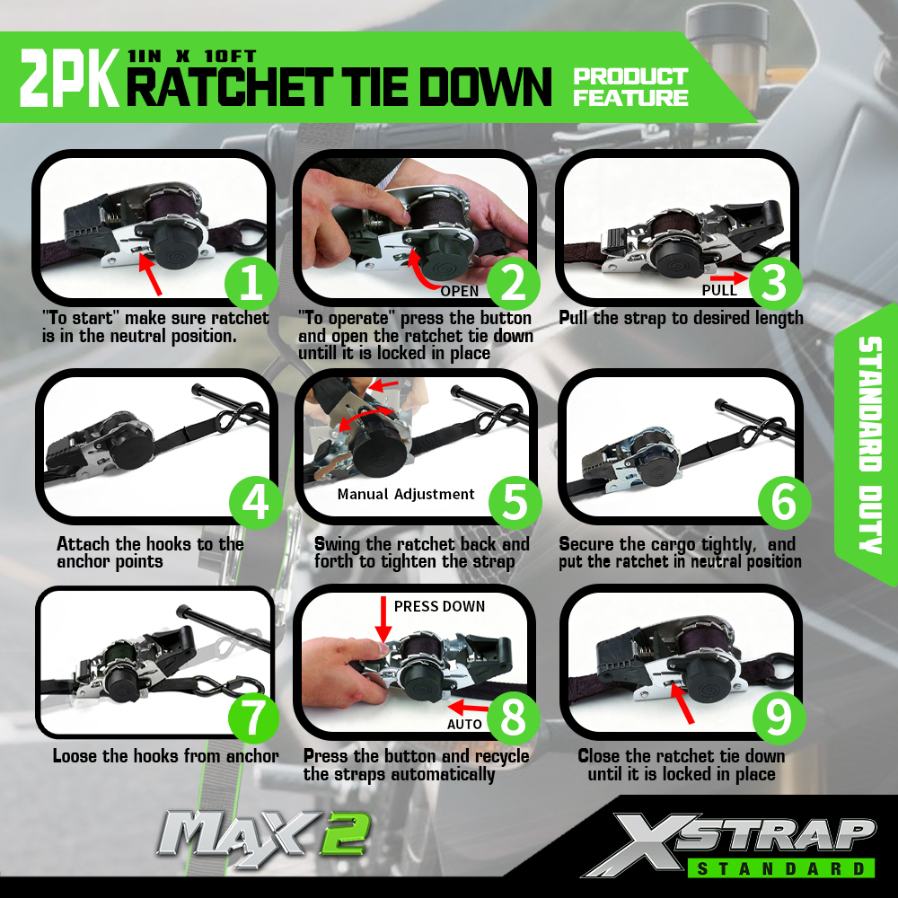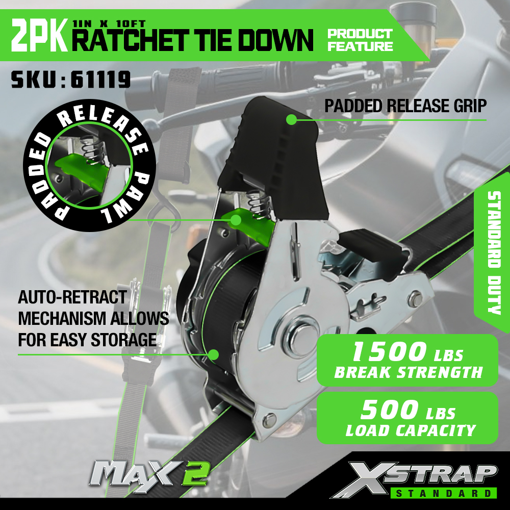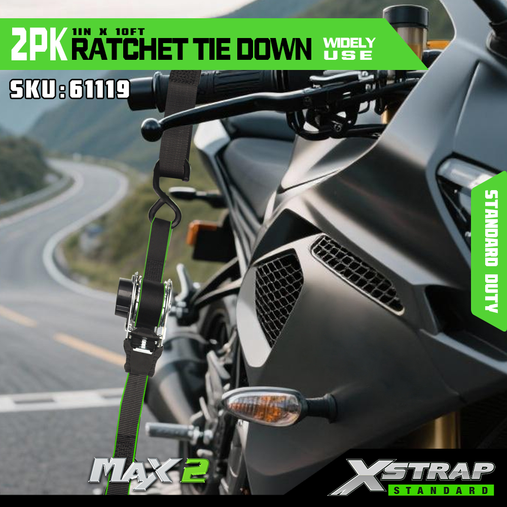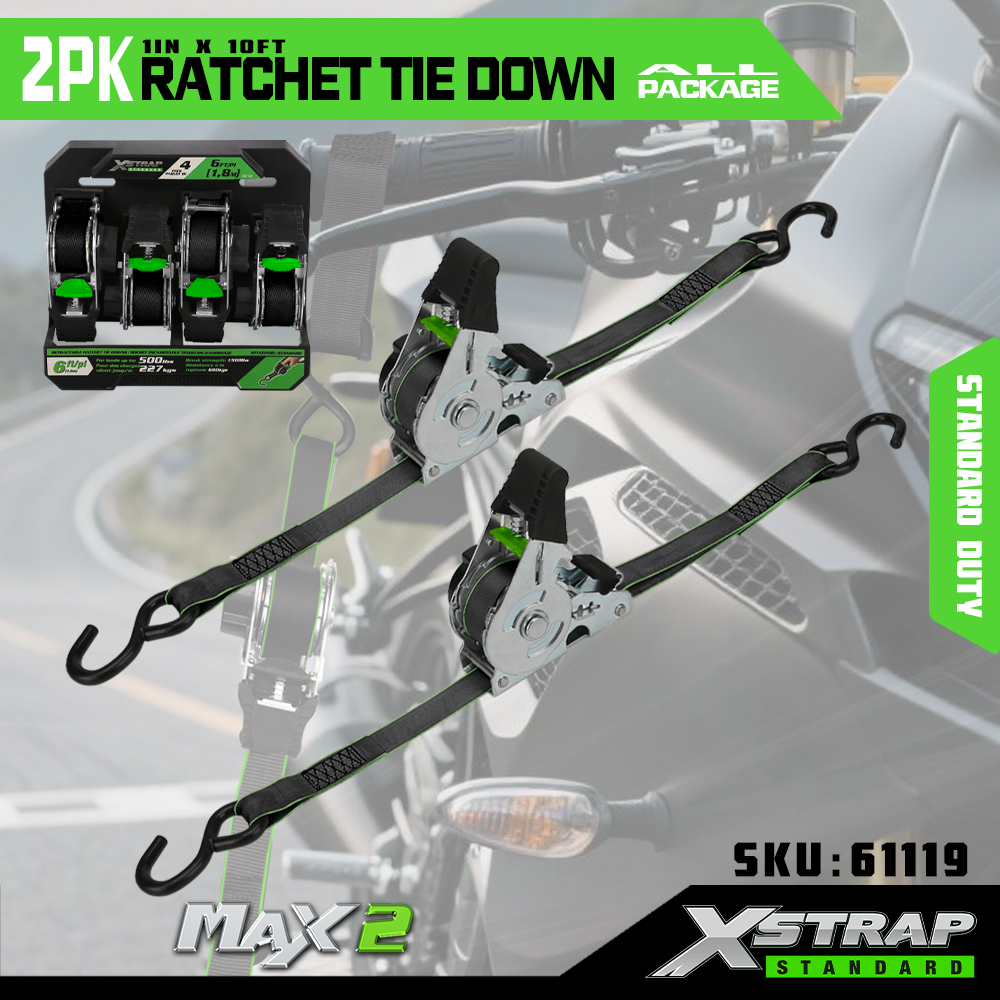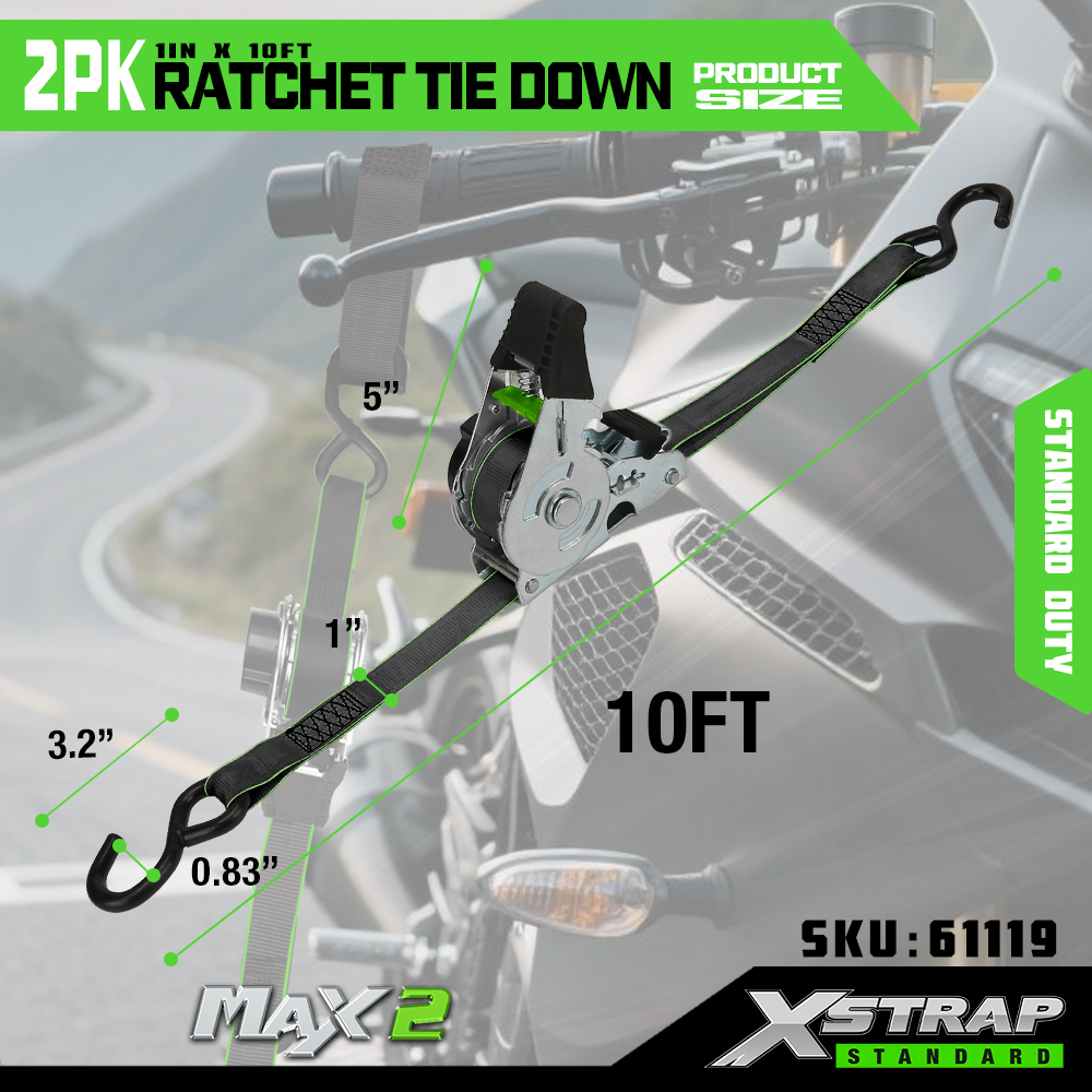 Xstrap 2 Pack Räikkäsidonta, 1 x 10 tuumainen polyesterisidontahihna, vetoräikkähihna, 500 lbs:n kuormankiinnityshihnat S-koukuilla avolava-autolle, maastoautolle, autotelineet moottoripyörälle, kevyelle kalastusveneelle, jet Skinille.