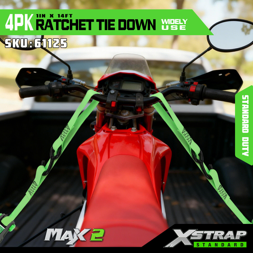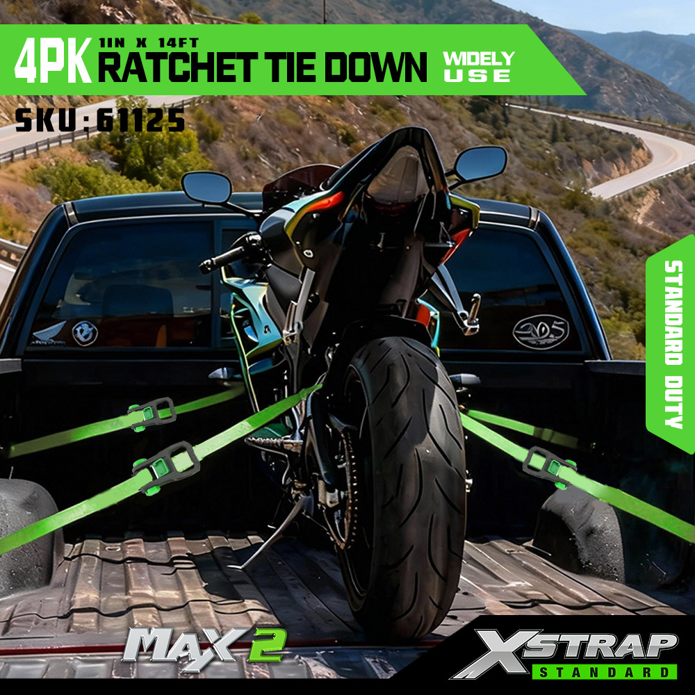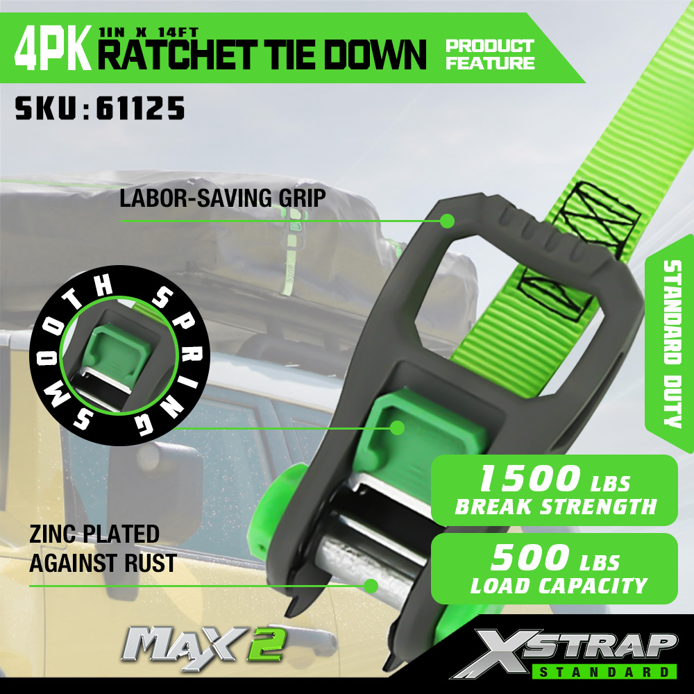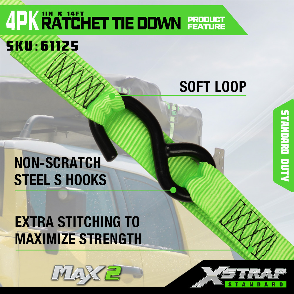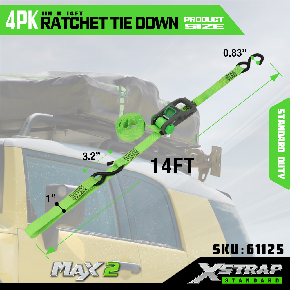 Xstrap 4 Pack Räikkäsidonta, 1 x 14 tuumainen polyesterisidontahihna pehmeällä räikkälenkillä, 500 lbs:n kuormankiinnityshihnat S-koukuilla avolava-autolle, maastoautolle, autotelineille, moottoripyörälle, kevyille katumaastureille, moottorikelkkaille, jet-kalastusveneille.