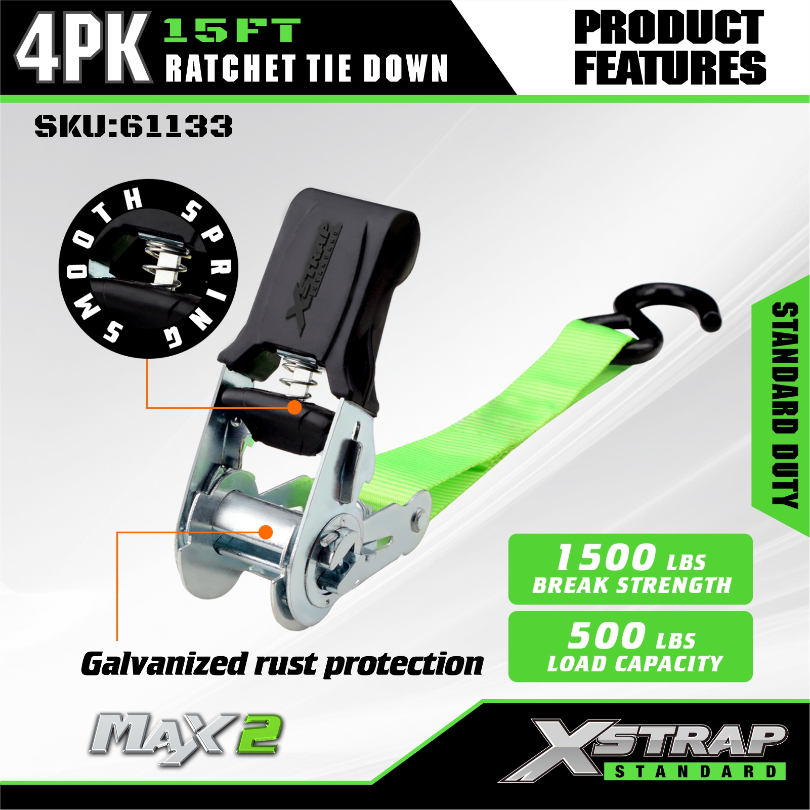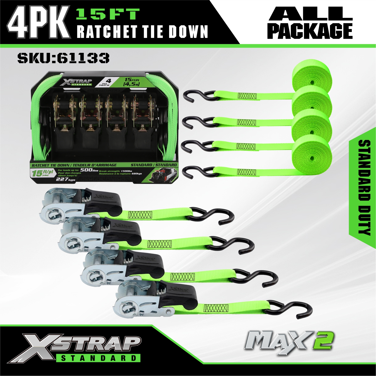 - Selkeä kuormituskapasiteettimerkintä: Jokaiseen sidontaan on merkitty selkeästi 227 kg / 500 lbs turvallinen työkuorma (SWL) ja 680 kg / 1500 lbs murtolujuus.