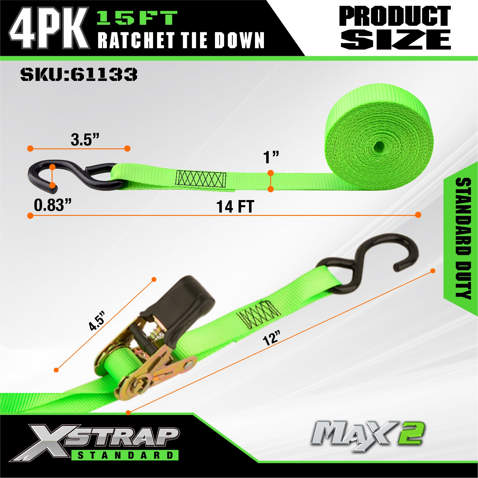 Xstrap 4 Pack Räikkä Tie Down, 1 x 15 tuumainen polyesterisidontahihna, vetoräikkähihna, 500 lbs:n kuormankiinnityshihnat S-koukuilla avolava-autolle, maastoautolle, auton ylätelineille moottoripyörälle, kevyelle kalastusveneelle, vesiskootterille, moottorisuihkulle.