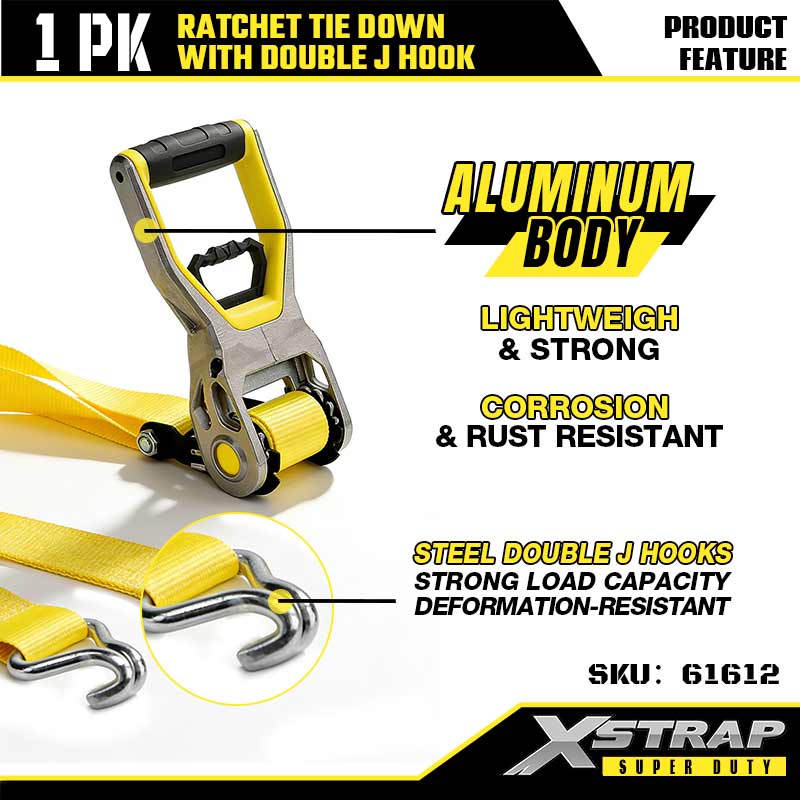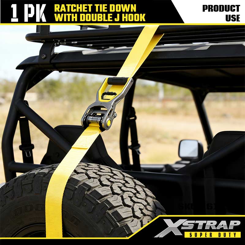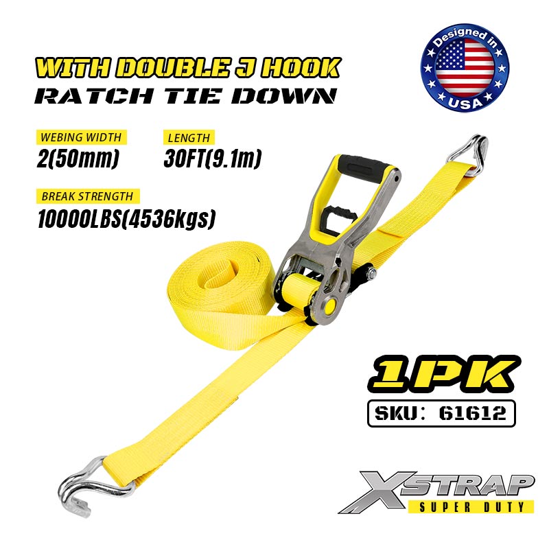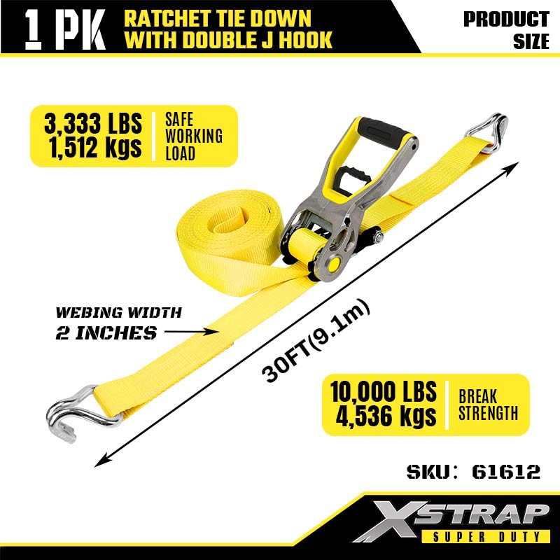 Xstrap 2PK Ratcet solmittava kaksinkertaisella J-koukulla, 2" x 30" polyesterisidontahihna Räikkähihna, 3333 lbs:n kuormankiinnityshihnat, joissa on kaksinkertaiset J-koukut raskaaseen perävaunuun, tasainen perävaunu, hiihtovene, pieni auto, raskas varuste.