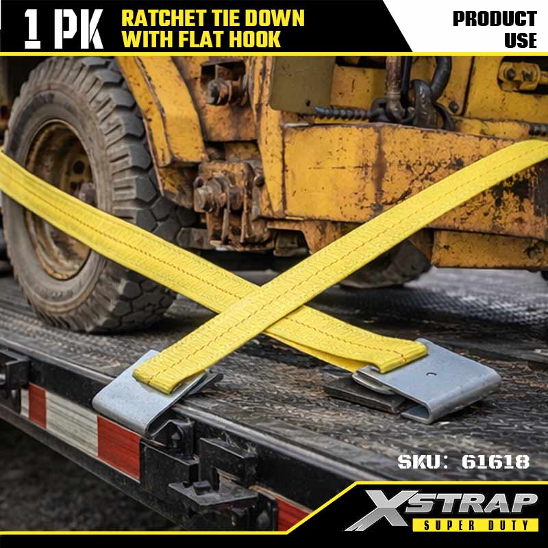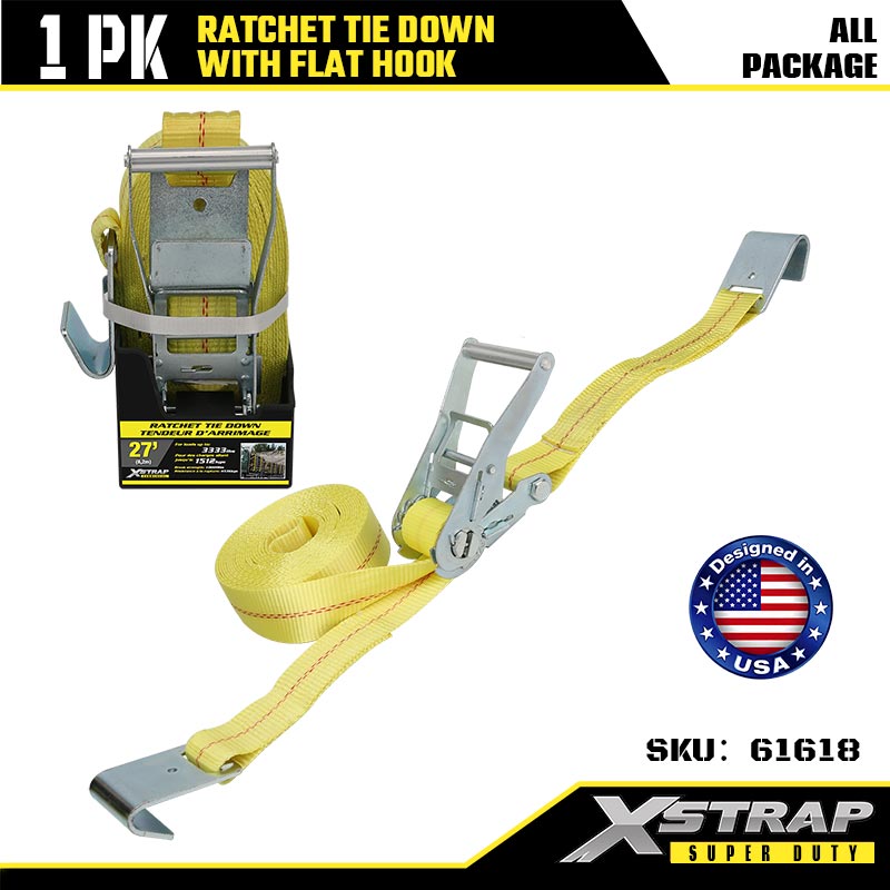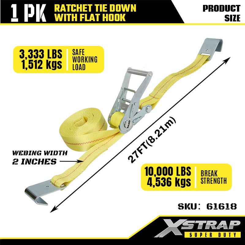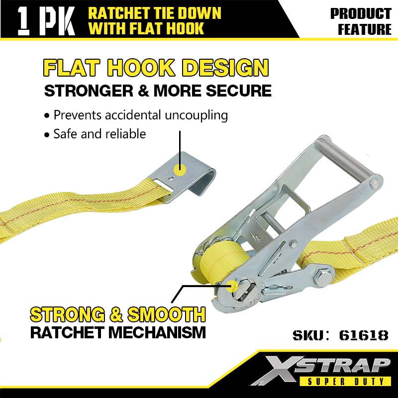Xstrap Ratcet solmio litteillä koukuilla, 2” x 27 tuuman polyesterisidontahihna, räikkähihna, 3333 lbs:n kuormankiinnityshihnat litteillä koukuilla raskaaseen perävaunuun, tasainen perävaunu, hiihtovene, pieni auto, raskaat varusteet.