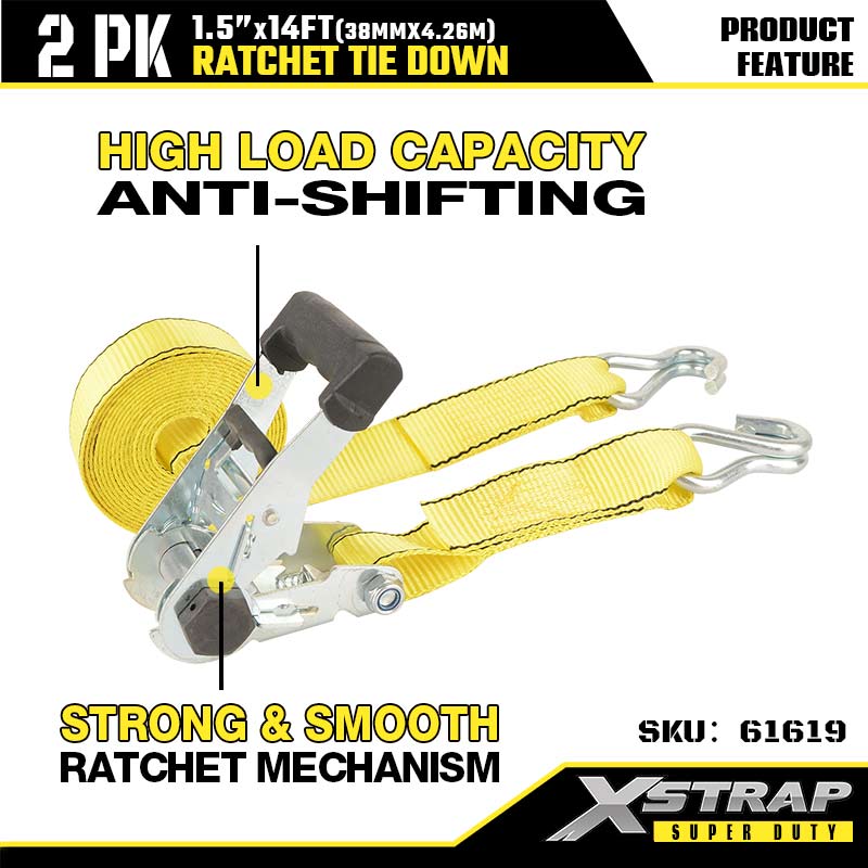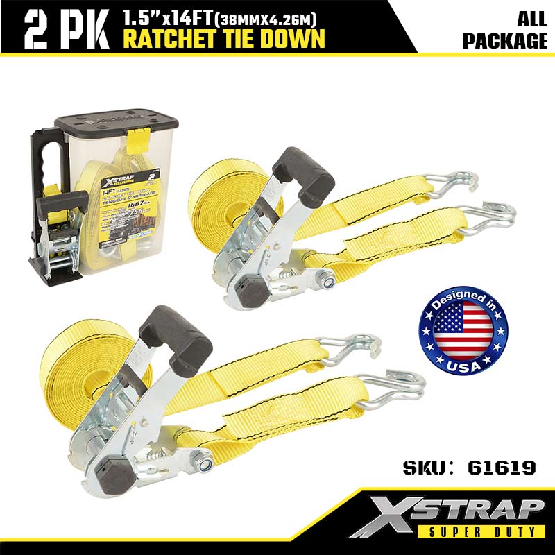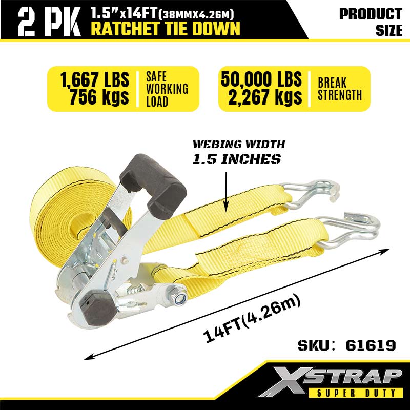 Xstrap 2PK Ratcet solmittava tupla J-koukulla, 1–1/2” x 14 tuuman polyesterisidontahihna, räikkähihna, 1667 lbs:n kuormankiinnityshihnat, joissa on kaksinkertaiset J-koukut raskaaseen peräkärryyn, tasainen perävaunu, hiihtovene, raskas auto.