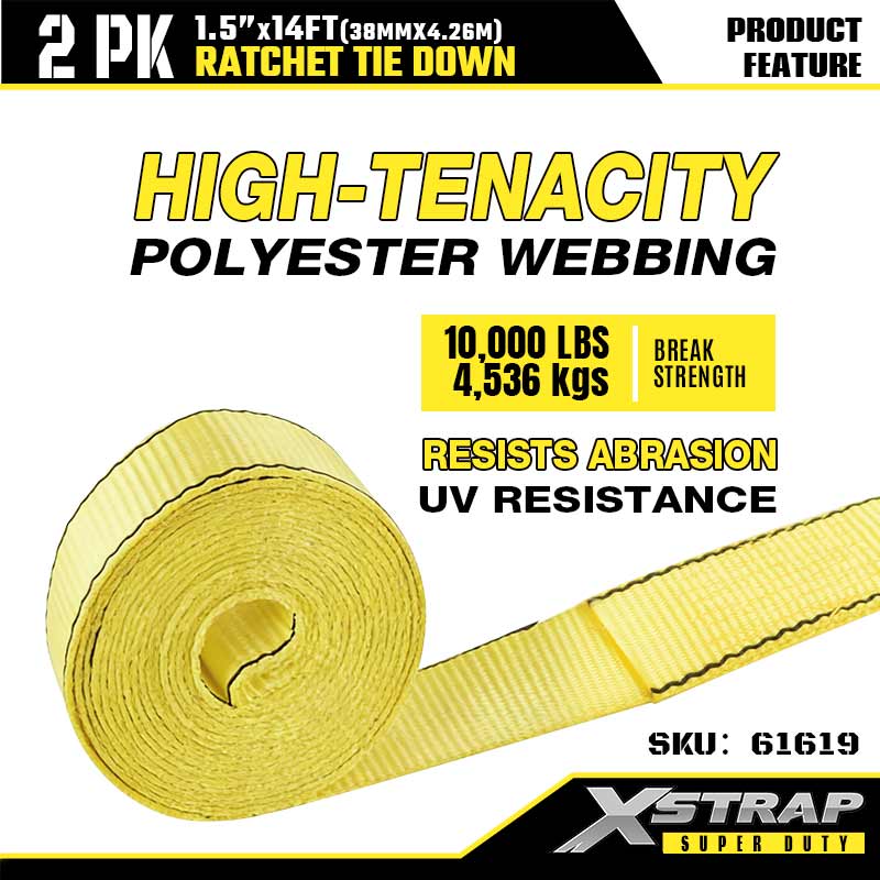 - Erittäin kestävä polyesterinauha: 1,5 tuuman leveä polyesterinauha kestää kulumista, venymistä ja hankausta. Se kestää UV-säteilyä ja kestää auringon ja sateen, joten se pysyy vahvana pitkäaikaisessa käytössä työmailla tai takateillä.